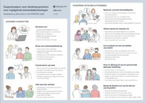 Behalve een podcast leverde de FAMICOM-studie een breed scala aan wetenschappelijke inzichten en concrete adviezen op voor zorgverleners. De Vos: “Voor ons onderzoek analyseerden we gesprekken tussen artsen en familieleden. Het gaf ons inzicht in de communicatieve en ethische dilemma’s die spelen, inzicht in hoe artsen en families hiermee omgaan en of (en hoe) zij er samen uitkomen. De resultaten hebben we vertaald naar een gesprekswijzer voor artsen: een infografic met aandachtspunten voor het voeren van deze gesprekken, vanaf het moment dat de eerste twijfels ontstaan over doorbehandelen, tot aan de beslissing om de behandeling te staken.”